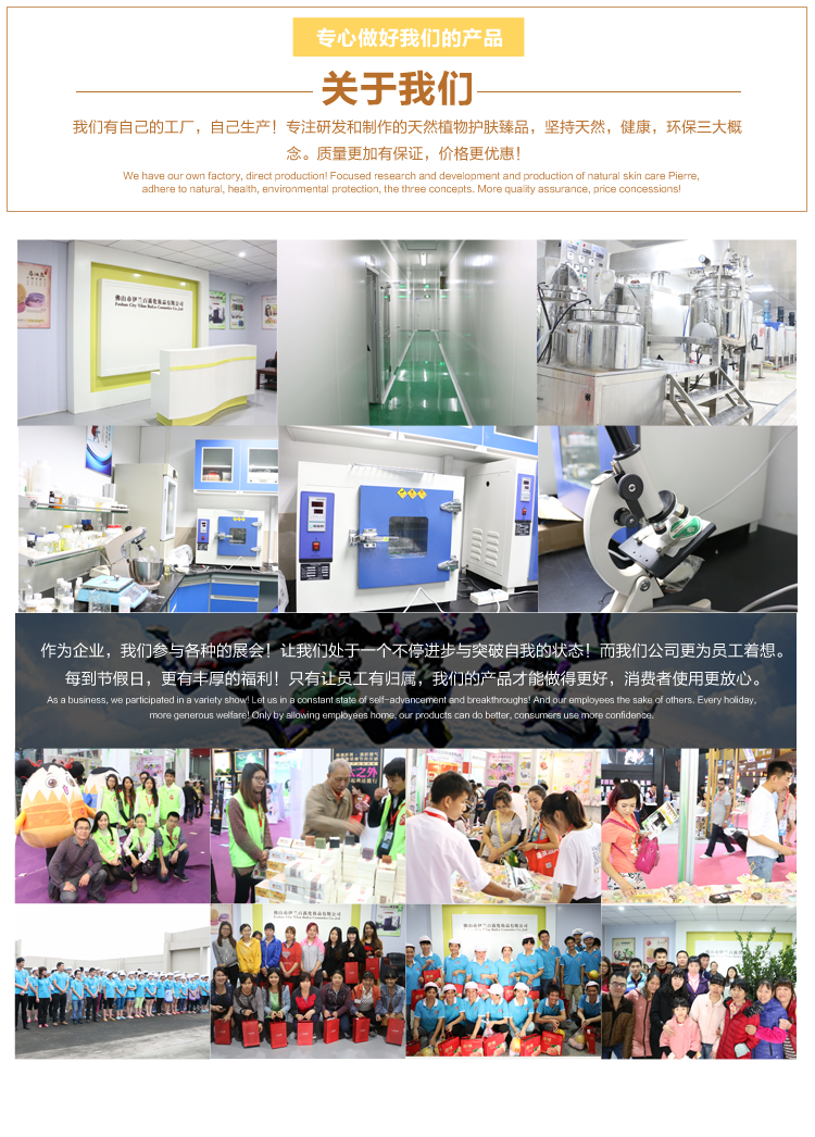 Our factory is located in Foshan Shishan Industrial Zone, which covers an area of 3000 square meters, which got the ISO22716 & GMPC certificate. The superior production equipment, professional and advanced technology, strictly quality controlled, to ensure the product is high quality. Our professional staffs & perfect after-sales service which get most clients approvals. We offer OEM, ODM service to meet different clients’ requests.